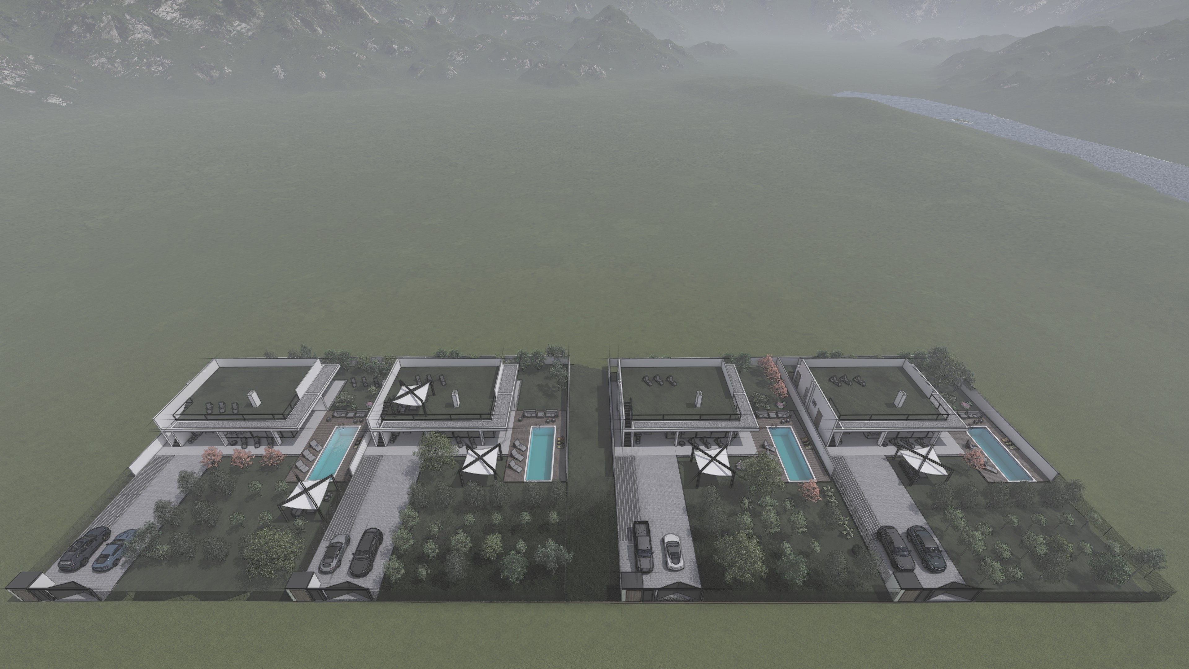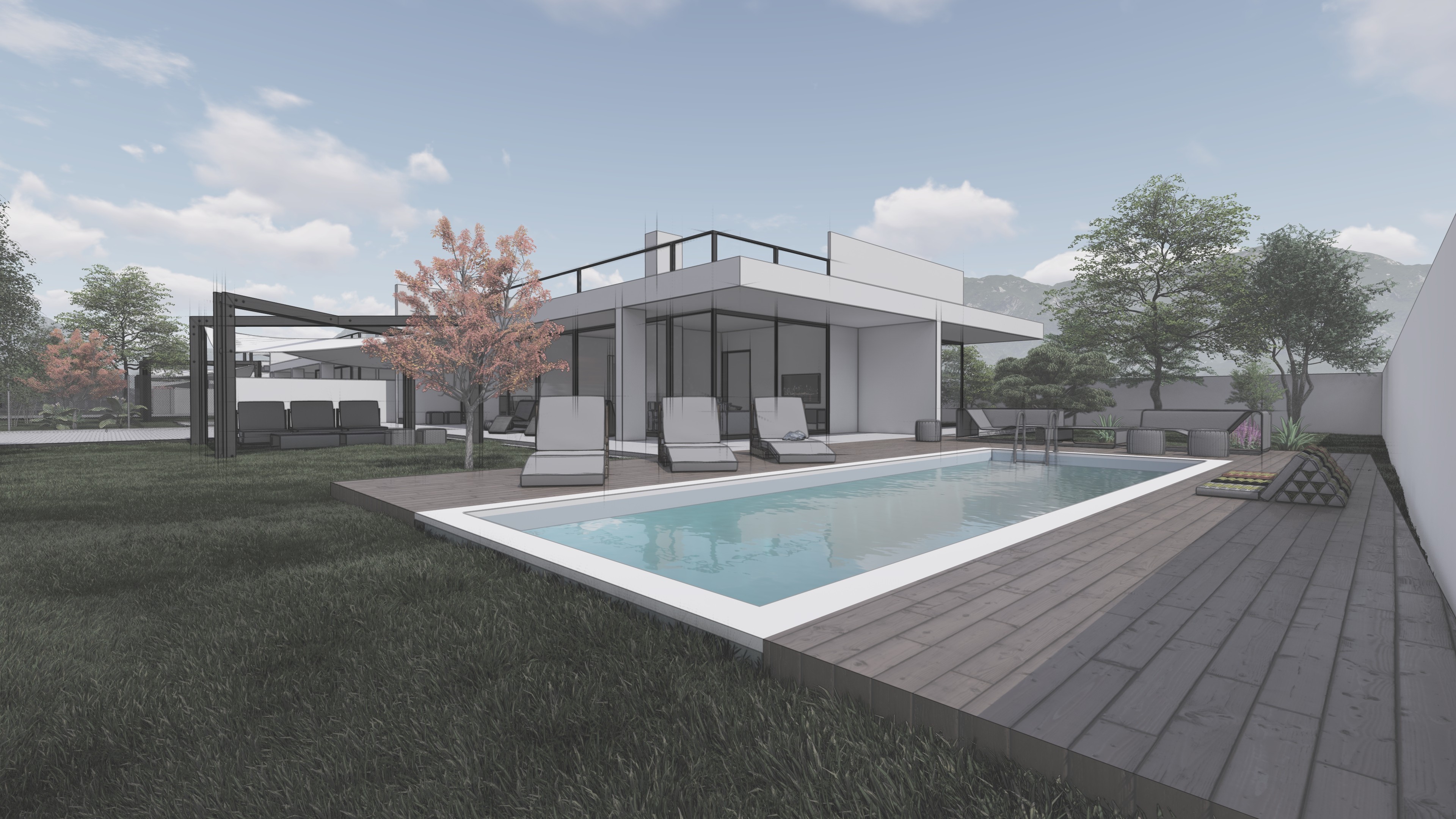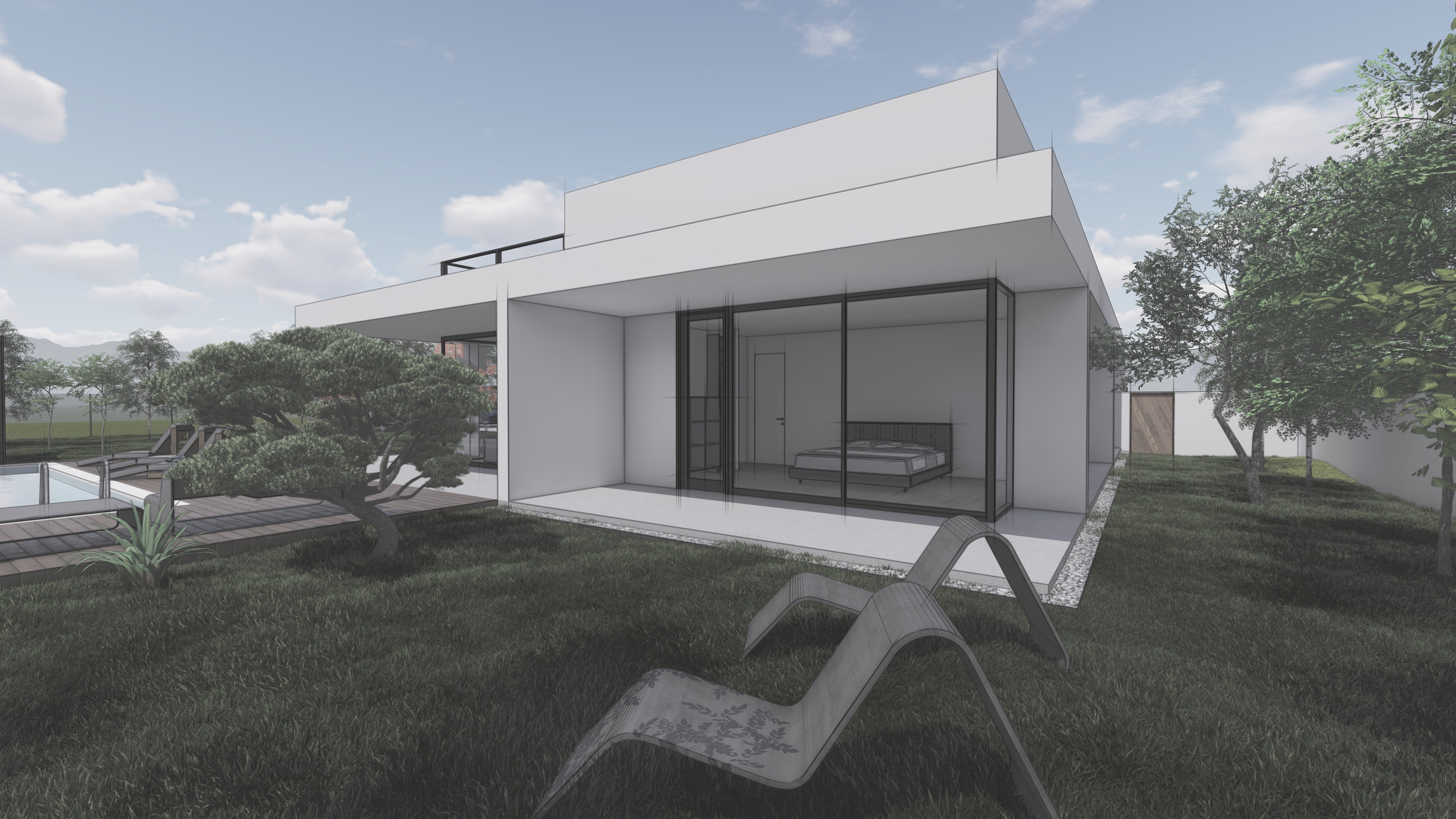 This house combines modern forms with a natural palette of materials, reflecting the surrounding landscape and creating a tranquil living environment.